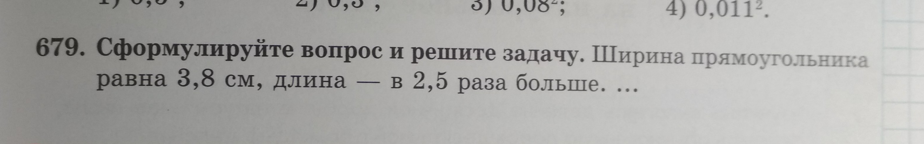 сформулируйте вопрос и решите задачу ширина прямоугольника равна 3,8 см длина в 2 ,5 раза больше