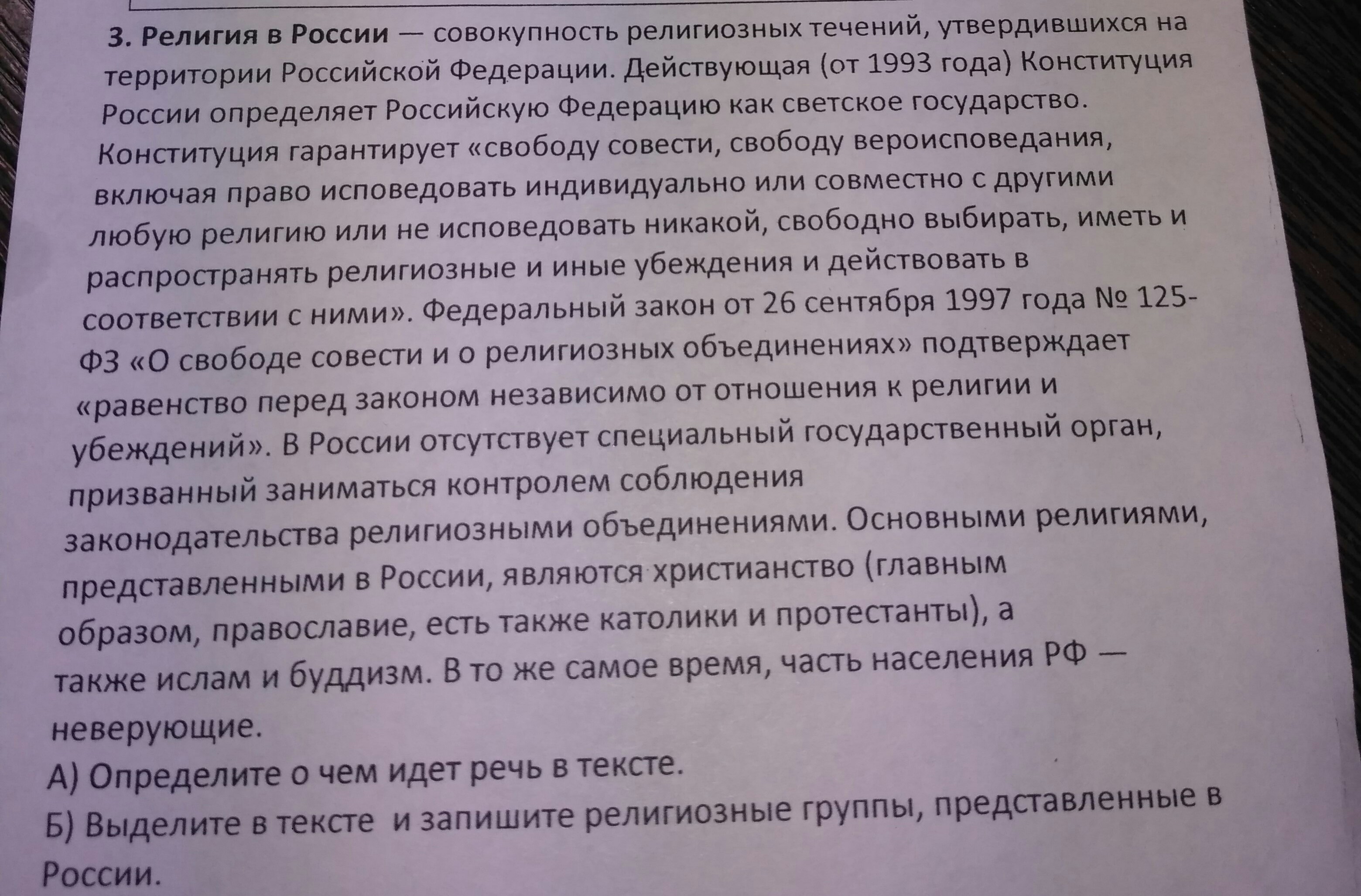 а) В тексте говорится о законах Российской Федерации, касающихся вероисповедания населения. Россия - светское государство, но каждый человек имеет полное право исповедать любую религию;