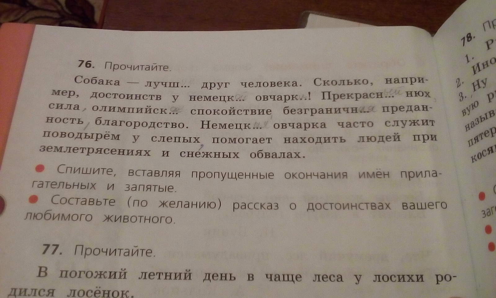 Собака - лучшИЙ (И.п.) друг человека. Сколько, например, достоинств у немецкОЙ (П.п.) овчаркИ (П.п.)! ПрекраснЫЙ (И.п.) нюх, сила, олимпийскОЕ (И.п.) спокойствие, безграничнАЯ (И.п.) преданность, благородство. НемецкАЯ (И.п.) овчарка часто служит поводырём у слепых, помогает находить людей при землетрясениях и снежных обвалах.