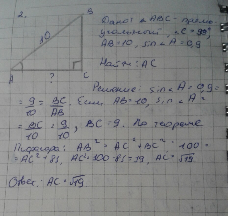 2 задачи. 1-ая: в треугольнике АВС угол С=90 градусов, катеты 6 и 8. Найти sin, cos, tg, ctg угла А. 2-ая: в треугольнике АВС угол С=90 градусов, гипотенуза 10, sinА=0,9. Найти АС