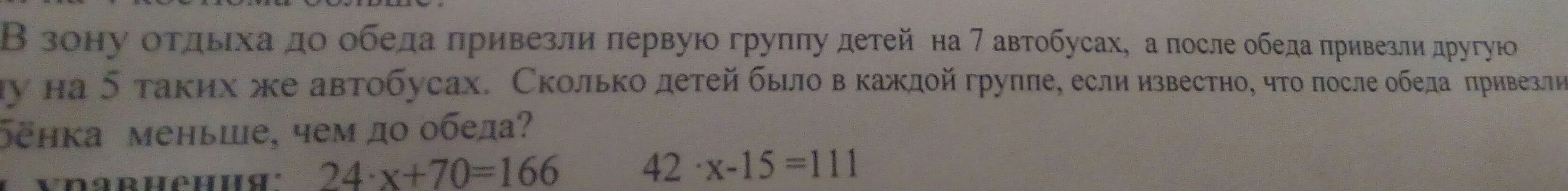 В зону отдыха до обедп привезли первую группу детей на 7 автобусах, а после обеда привезли другую группу на 5 таких же автобусах. Сколько было в каждой группе, если известно, что после обеда привезли на 62 ребенка меньше, чем до обеда?