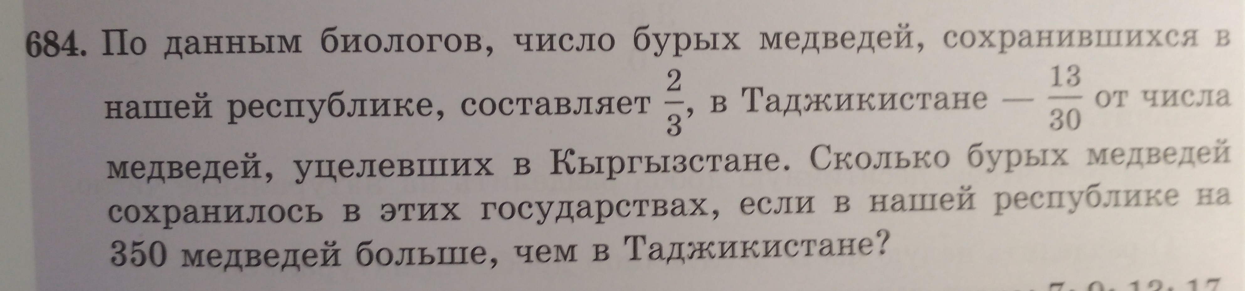 1) 2/3 - 13/30 = 7/30 - часть составляют 350медведей.