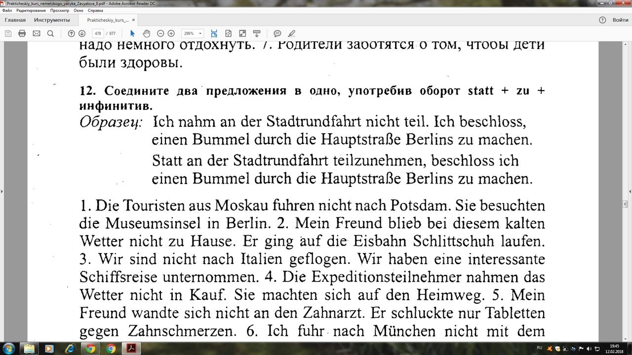 Statt nach Potsdam zu fahren,besuchten die Touristen die Museuminsel in Berlin. Statt bei diesem kalten Wetter zu Hause zu bleiben,ging mein Freund auf die Eisbahn Schlittschuh laufen.Statt nach Italien zu gfliegen, haben wir eine interessante Schiffreise unternommen.Statt das Wetter in Kauf zu nehmen, machten sich die Expeditionsteilnehmer auf den Heimweg.Statt sich an den Zahnarzt zu wenden, schluckte er nur Tabletten gegen Zahnschmerz.
