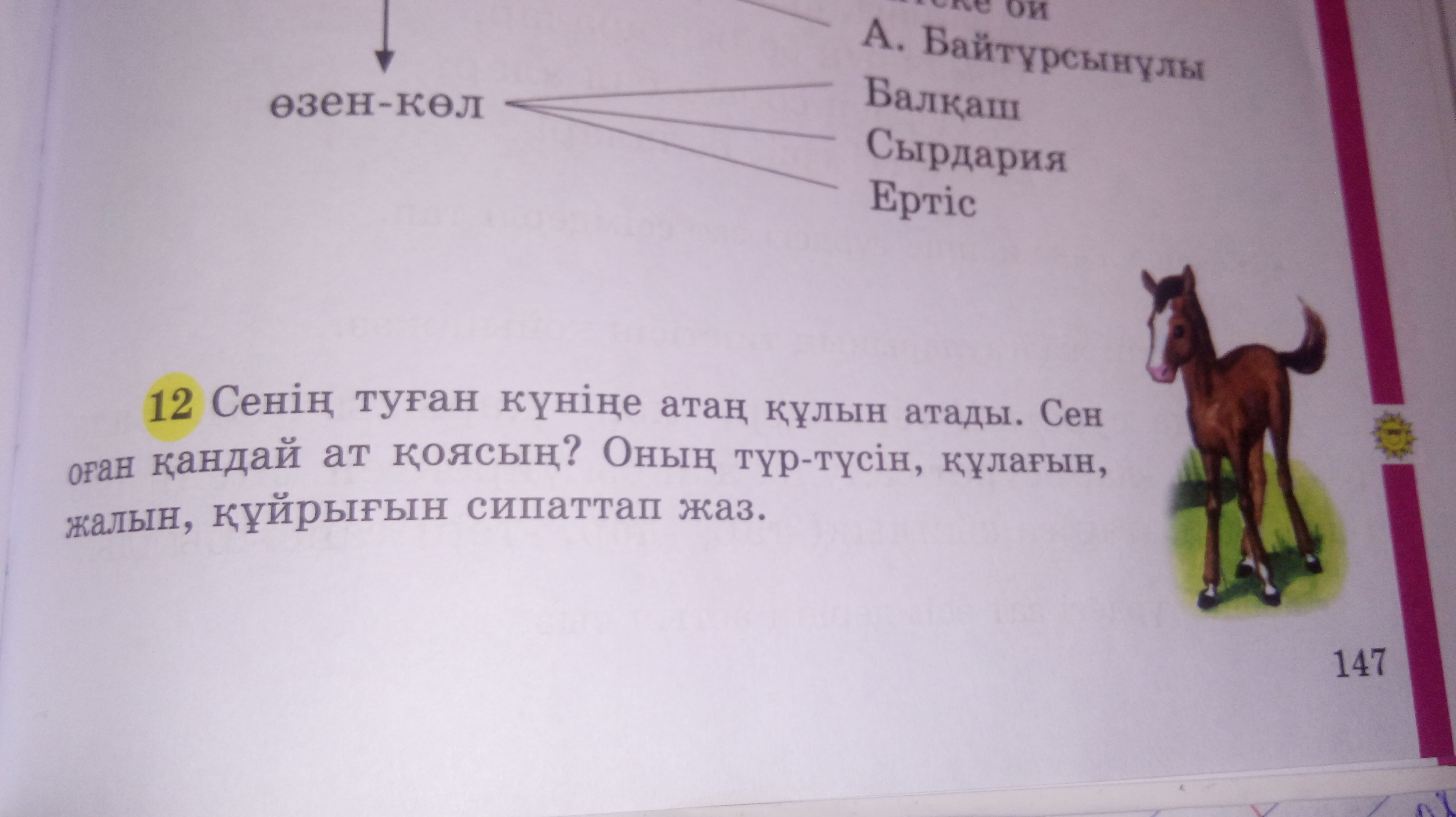 Менин туган куниме атам кулын сыйлады. Мен оган Тулпар деп ат койдым. Онын тур-туси коныр, кулагы тик турган, ал жалыны мен куйрыгы кара тусти.