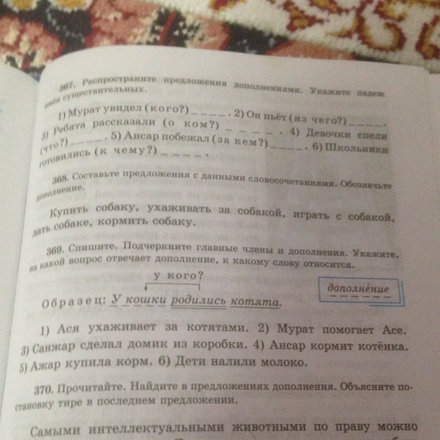 Упр.369: Ася(подлежащее) ухаживает(сказуемое) (за кем?) за котятами (дополнение). Мурат ( подлежащее) помогает (сказуемое) (кому?) Асе (дополнение). Санжар(подлежащее) сделал (сказуемое) (что?) домик (дополнение) (из чего?) из коробки ( дополнение). Ансар (подлежащее) кормит(сказуемое) (кого?) котенка (дополнение). Ажар (подлежащее) купила (сказуемое) (что?) корм(дополнение). Дети (подлежащее) налили(сказуемое) (что?) молоко (дополнение)