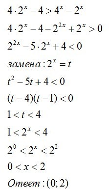 2^2(2^x-1)>2^x(2^x-1); 2^2(2^x-1)-2^x(2^x-1)>0; (2^x-1)* *(2^2-2^x)>0; 2^x-1>0;2^x>2^0; x>0; 2^2-2^x>0; x<2; ответ: (0;2)