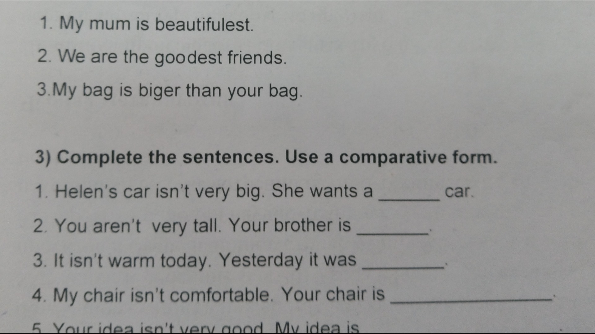 5. Complete the gaps with the correct form of the adjectives in brackets. 1. Adam is twice as Sean (funny) 2. Actually, 7.30 is (early) l meet you 3. Harry is (popular) boy in the school. 4. The much) he said, the angry) I felt. 5. John isn't (good-looking) as his brother.