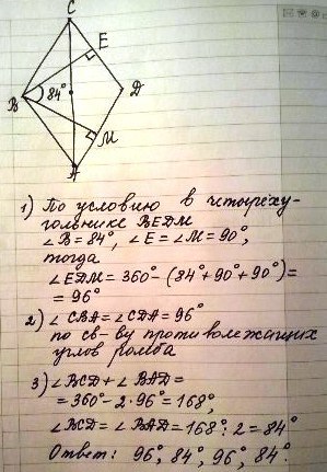 Угол, между высотами ромба, выведенные из одной вершины, составляет 84 градусов. Найти углы ромба. Помогите, пожалуйста!
