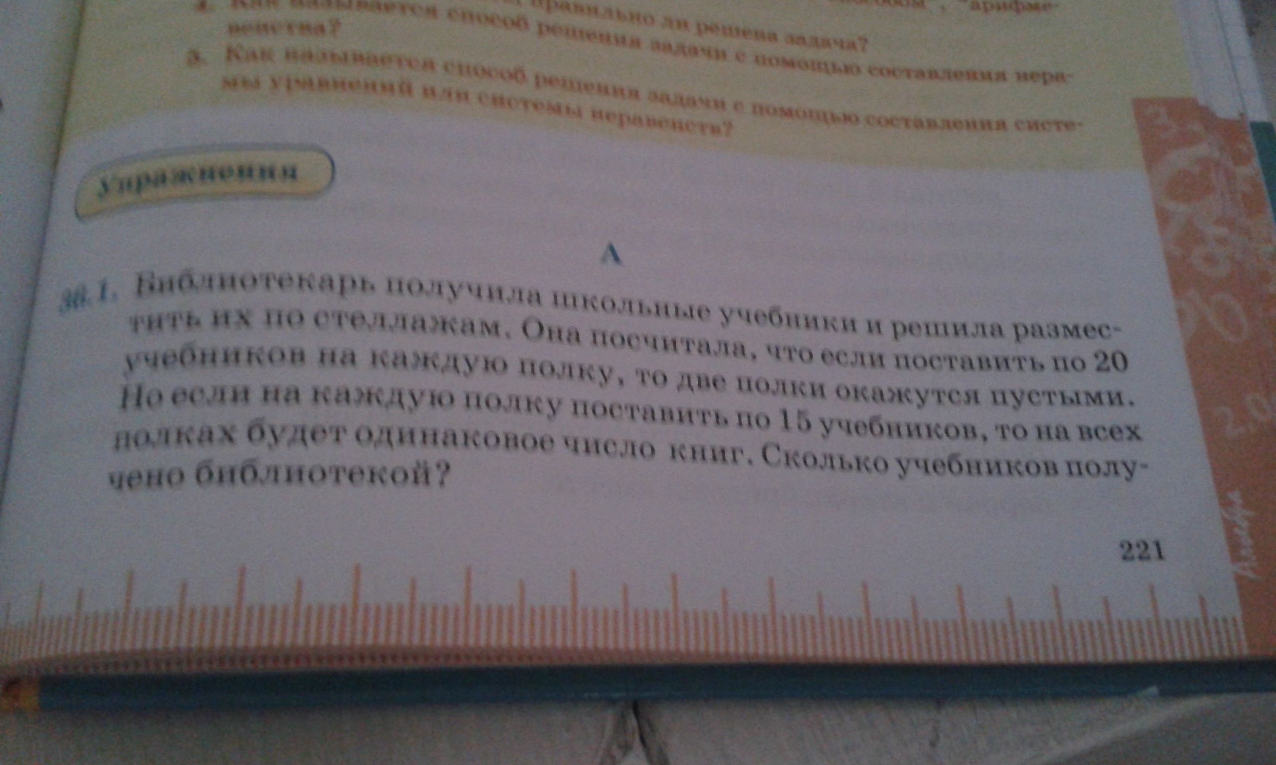 При размещение по 20 учебников - 20*(x-2), при размещение по 15 учебников - 15x