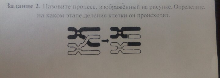 Назовите процесс изображенный на рисунке. Определите на каком этапе деления клетки он происходит.