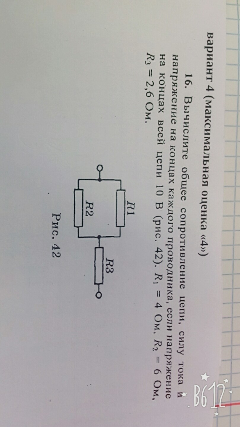 Вычислите общее сопротивление цепи, силу тока и напряжение на концах каждого проводника, если на концах всей цепи 10В R¹=4 Ом, R²=6 Oм, R³=2,6 Oм
