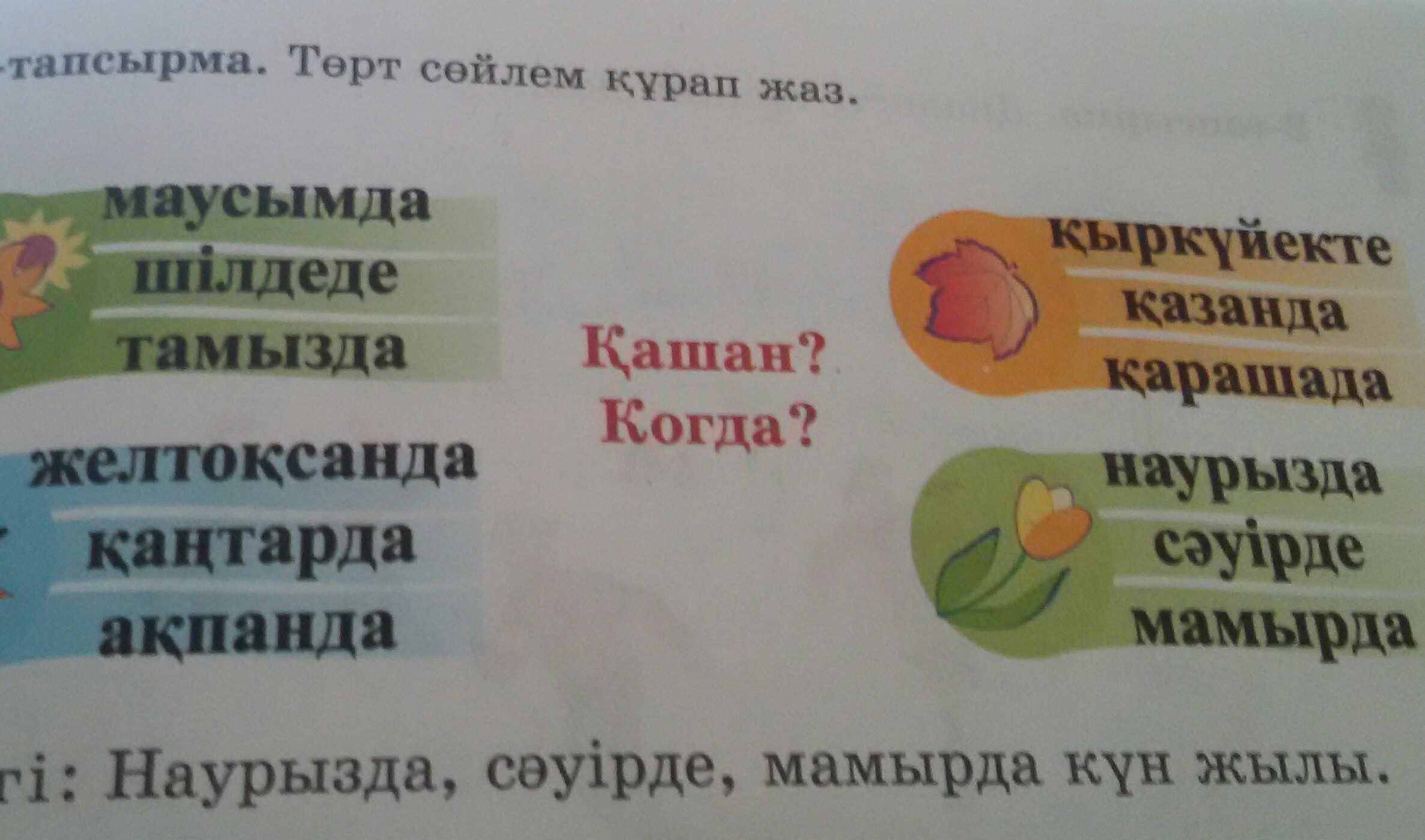 Мен мамырда мектеп бітіремін.Қыркүйекте балалар мұғалімдерге гүл береді.Наурыздың сегізінде қыздар күні. Қаңтарда күн өте суық