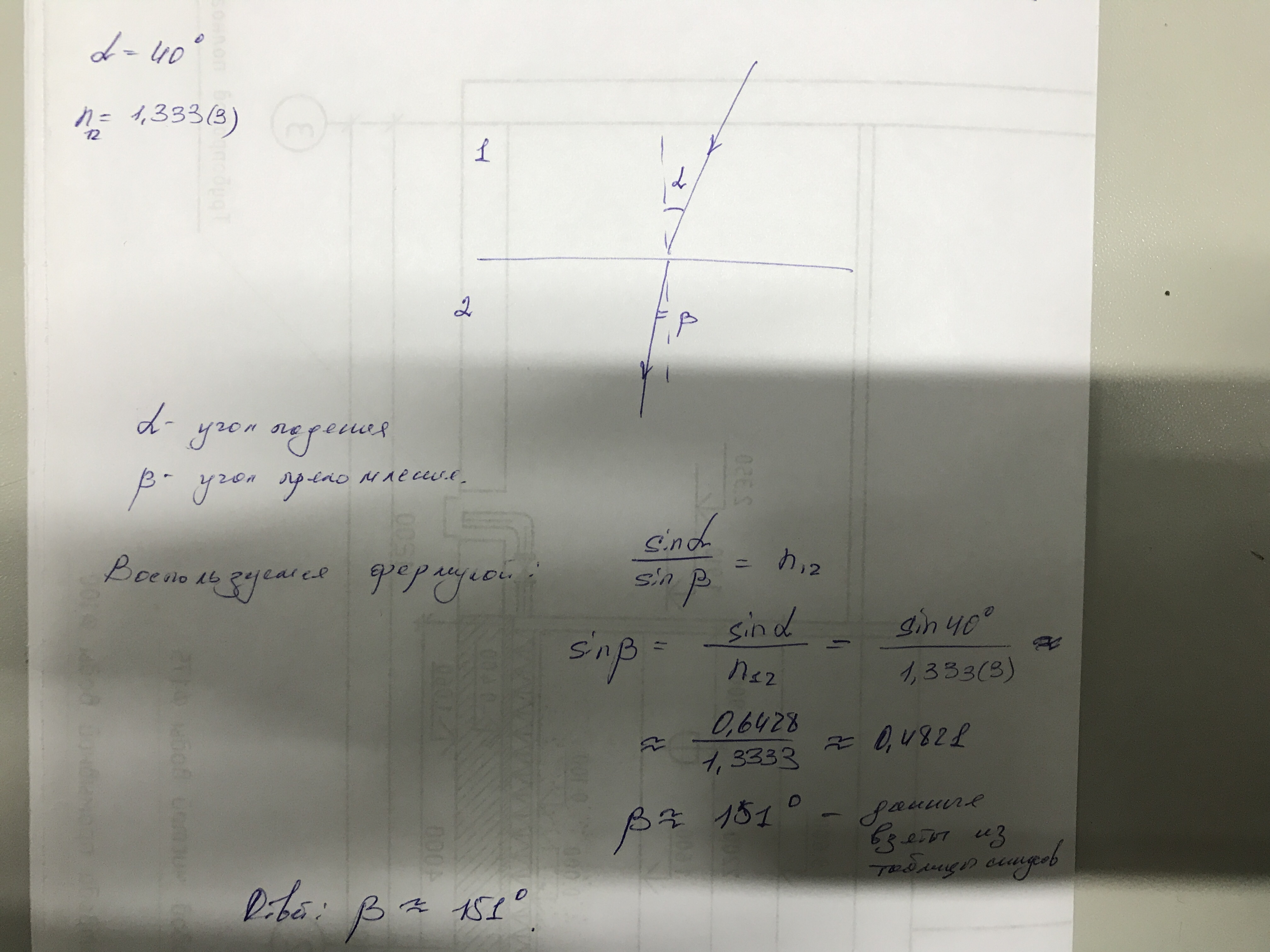 Луч света переходит из воздуха в воду.угол его падения равет 40 градусов .найдите угол преломления .показатель преломления воды равет 1.333...