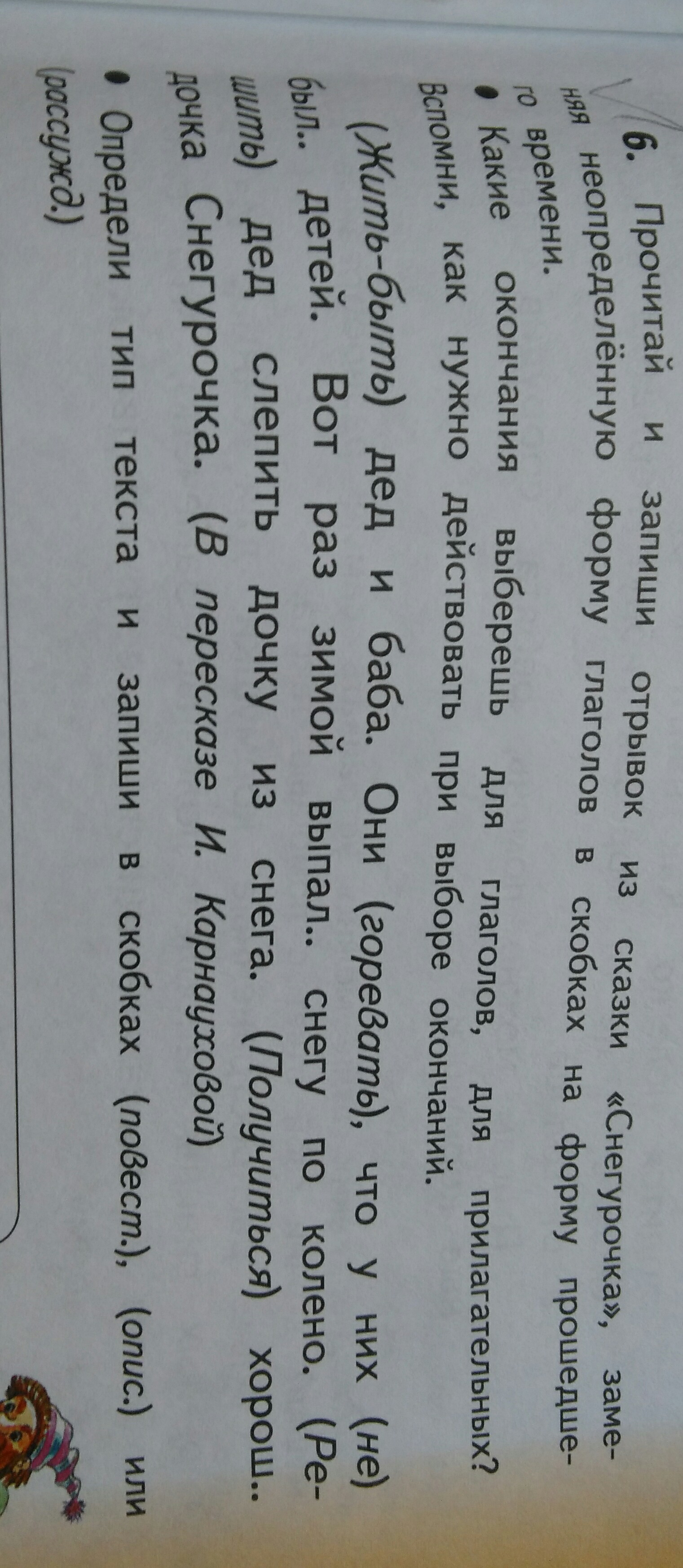 Жили-были дед и баба.Они горевали,что у них не было детей.Вот раз зимой выпало снегу по колено.Решил дед слепить дочку из снега.Получилась хороша дочка Снегурочка.(В пересказе И.Карнауховой)