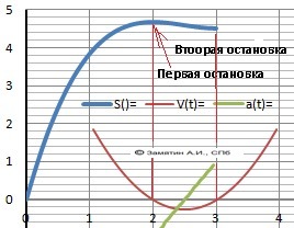 S(3) = 27/3 - 45/2 + 18 = 4 1/2 м - до второй остановки.