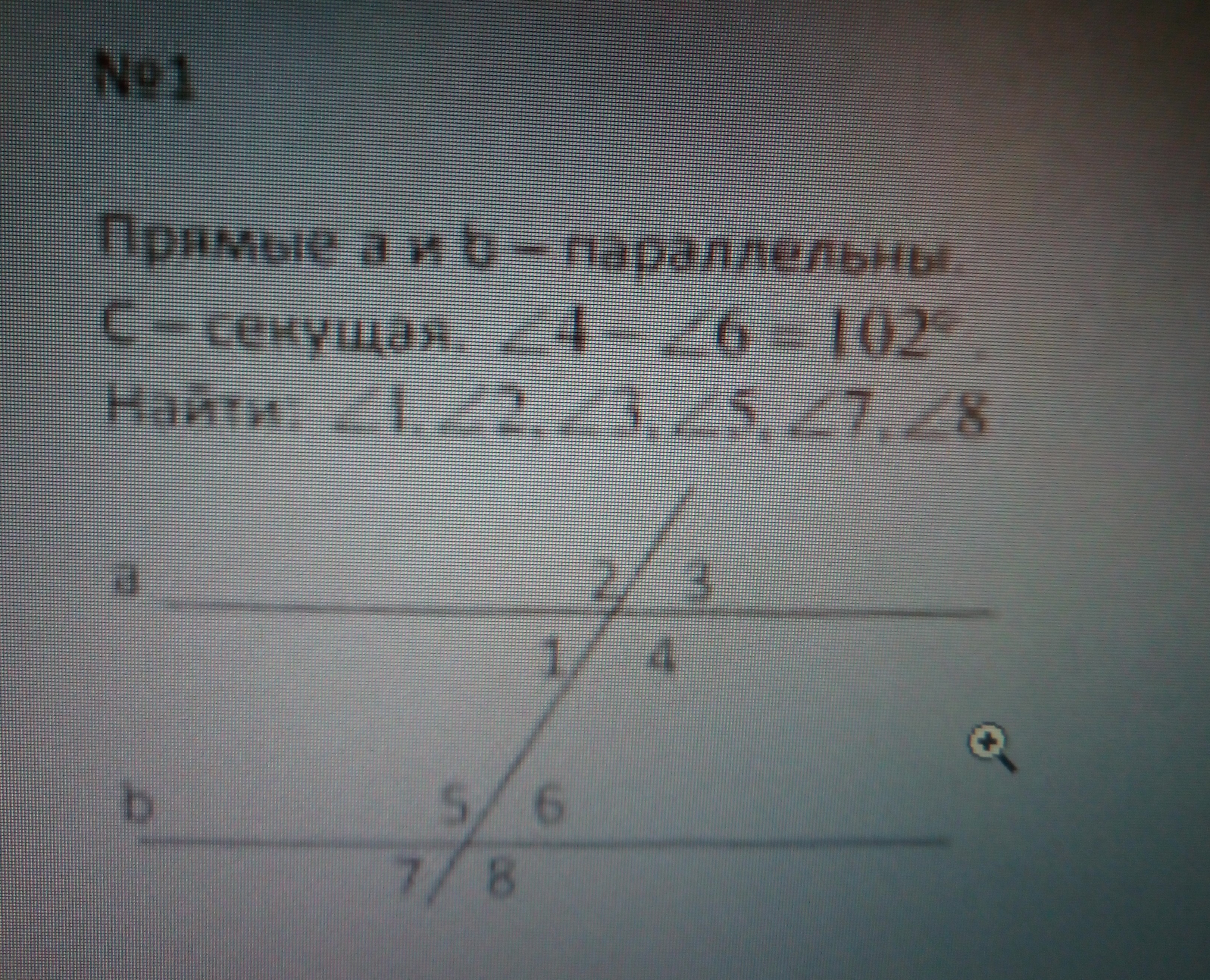 Угол 1=угол 6, так как они накрест лежащие. Сумма смежных углов равна 180. Значит угол 1+угол4=180 и угол 4-угол 1=102. угол4=102+угол1. угол1+102+угол1=180 => угол 1=39, значит угол 4=180-39=141. Так как a||b, то угол1=угол7=угол3=угол6=39. Угол 4=угол2=угол8=угол5=141.