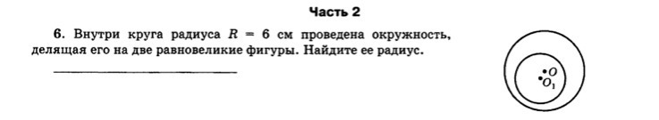 Внутри круга радиуса R=6 см проведена окружность,делящая его на две равновеликие фигуры. найдите ее радиус.