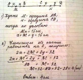 отрезок, равный 28 см, разделен на 3 неравных отрезка. Расстояние между серединами крайних отрезков 16 см. Найти длину среднего отрезка.