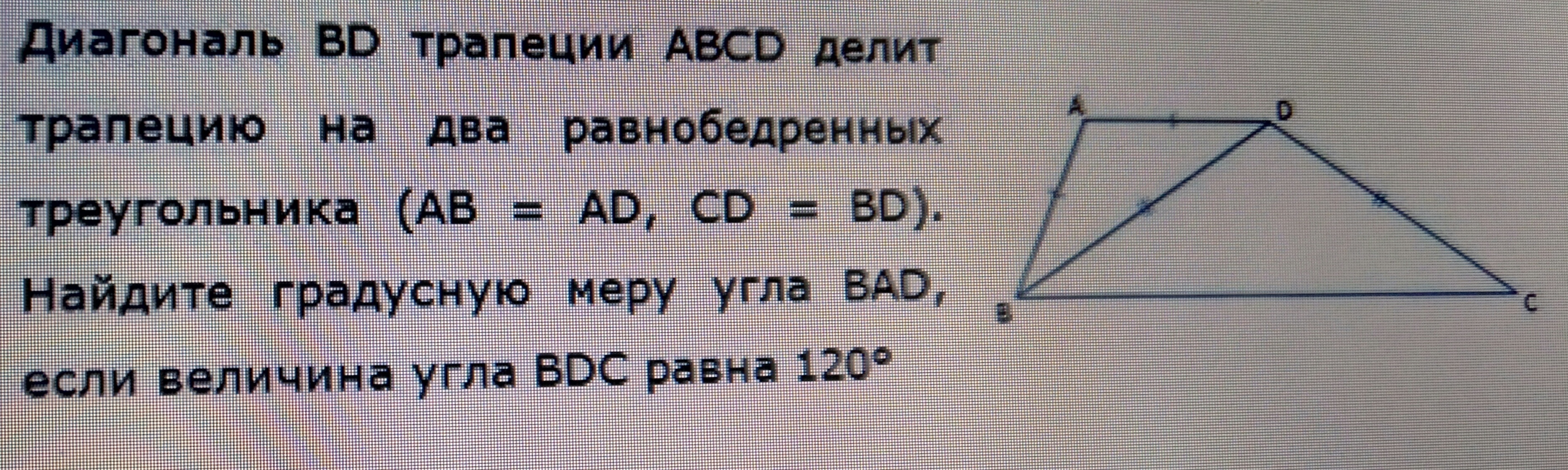 св-ва углов в трапеции: Сумма углов трапеции, прилежащих к боковой стороне, равна 180° ⇒ ∠д+∠с=180°, ∠д=180-30=150°