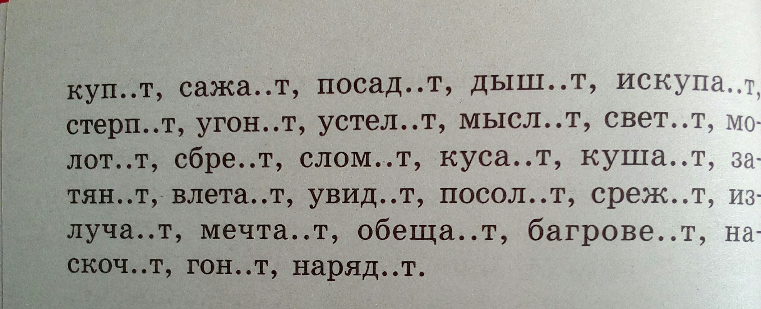 купит, сажает, посадит, дышит, искупает, стерпит, угонит, устелет, мыслит, светит, молотит, сбреет, сломает, кусает,кушает, затянет, влетает, увидит, посолит, срежет, излучает, мечтает, обещает, багровеет, наскочит, гонит, нарядит.