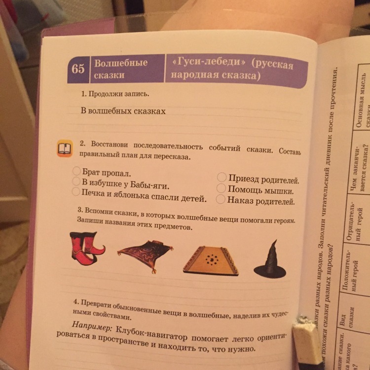 2)Наказ родителей, брат пропал, в избытке у яги, помощь мышки, печка спасла, приезд родителей.