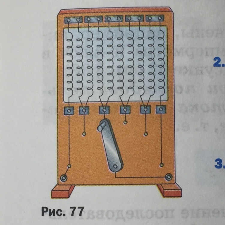 1. На рисунке 77 изображён реостат, с помощью которого можно менять сопротивление в цепи не плавно, а ступенями — скачками. Рассмотрите рисунок и по нему опишите, как действует такой реостат.