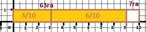 Помогите решить срочно: За первый день трактор вспахал 3/10 части поля, за второй день ещё 6/10 поля. Чему равна площадь поля, если за два дня трактор вспахал 63 га? (если мужик то схему пж)