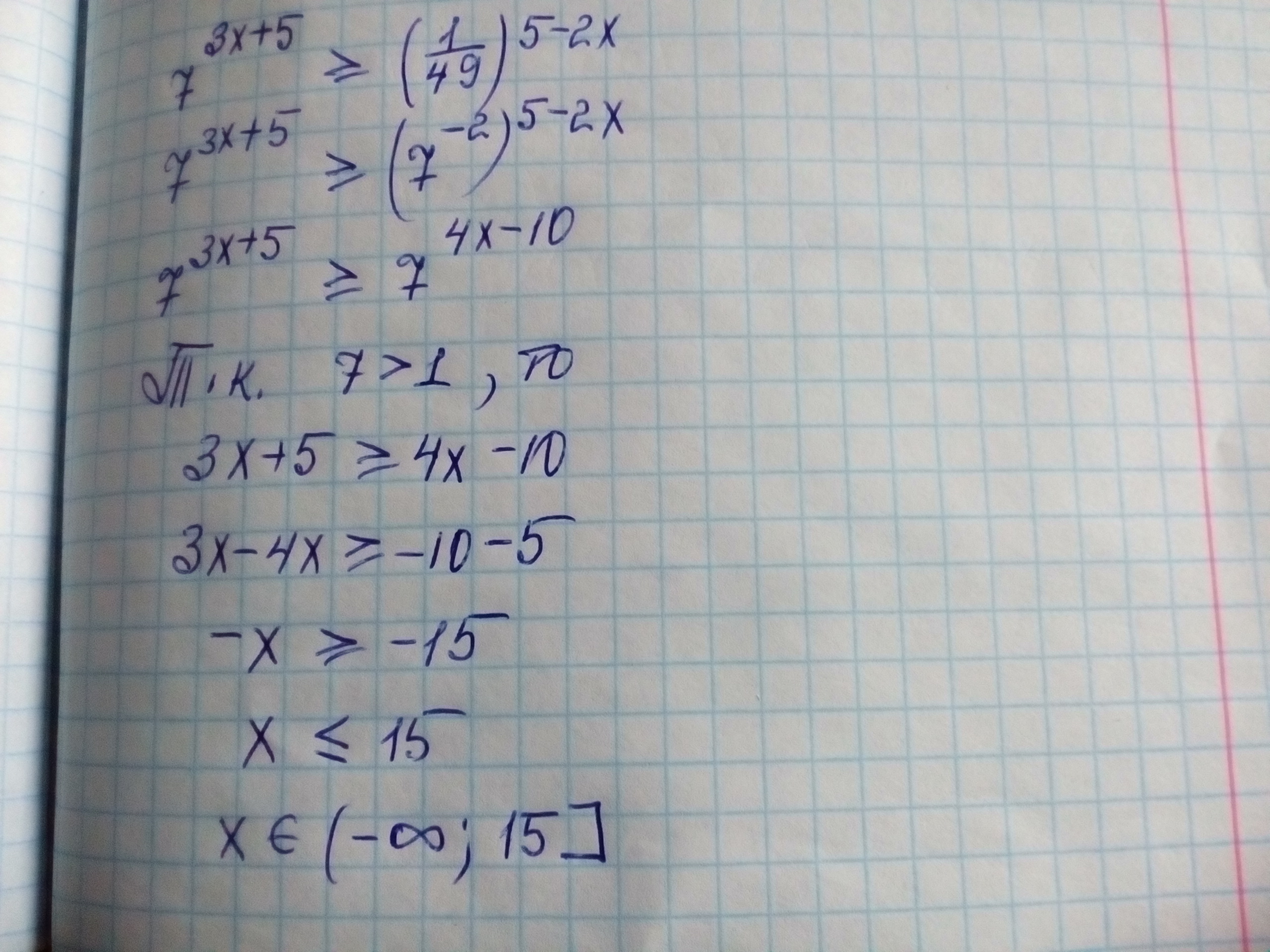 7^3x+5>=(7^-2)^5-2x; 7^3x+5>=7^4x-10; 3x+5>=4x-10; 3x-4x>= -10-5; -x>= -15; x<=15. Ответ: x<=15.