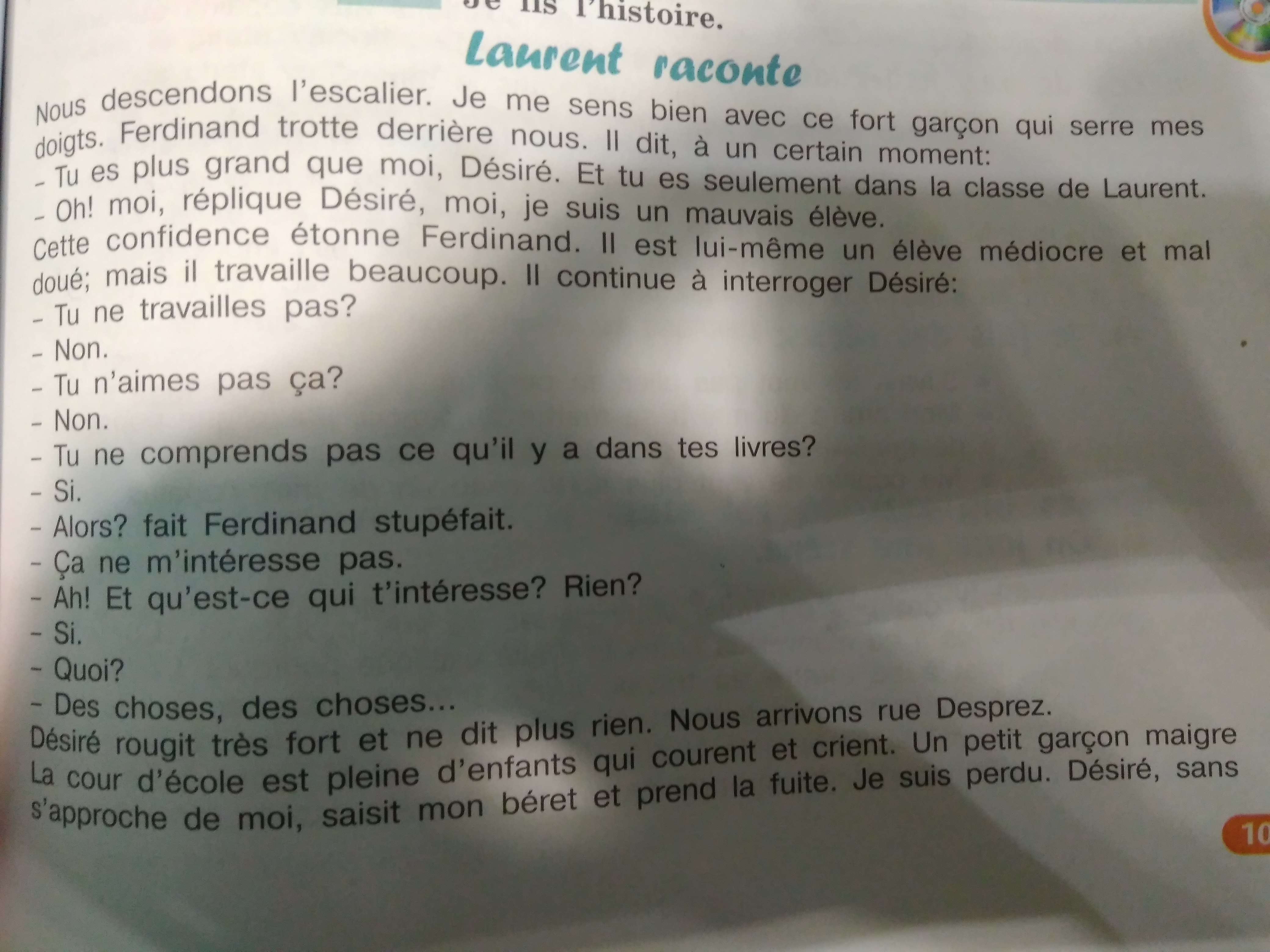 Лоран говорит нам, что мы спускаемся по лестнице. Я чувствую себя хорошо с этим сильным мальчиком, который обнимает его след за нами. Он говорит, к определенному Ты выше меня, Желание. И ты только в классе Лорана. Я, - отвечает «Желание», - я плохой. Эта уверенность удивляет Фердинанда. Он сам посредственный и не очень много работает. Он продолжает задавать вопрос Дезире: Разве вы не работаете? Нет. У вас этого нет? Нет. Разве вы не понимаете, что в ваших книгах? Если. Итак? Фердинанд ошеломлен. Меня это не интересует. Ах! А что вас интересует? Ничего? Что? Вещи, вещи ... ничего. Мы приходим на улицу Desprez. тощий Желание краснеет очень сильно, кто бежит и кричит. маленький мальчик без школы полна детей убегает. Я потерян. Пожелайте, подойдите ко мне, возьмите мой и 3AKPblTb