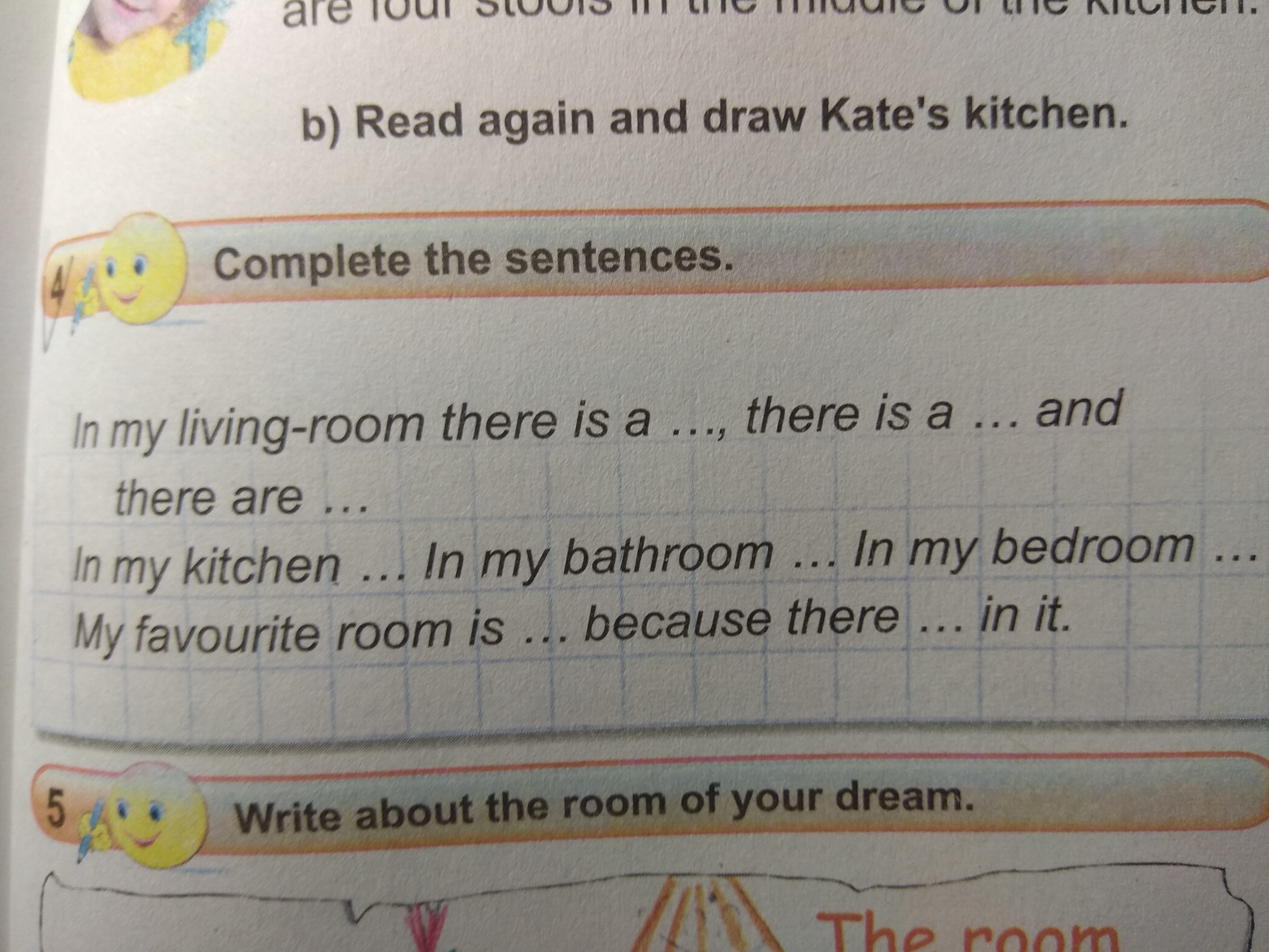 In my kitchen there is a table, there is fridge and there are chairs. In my bathroom there is mirror, there is bath and there are towels. In my bedroom there is bed, there is table, there is toys and books. My favorite room is my bedroom, because there are my toys it in.