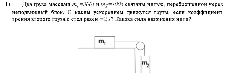 a=g*(m2-μ*m1)/(m1+m2)=10*(0.1-0.1*0.3)/(0.1+0.3)=1.75 м/с2