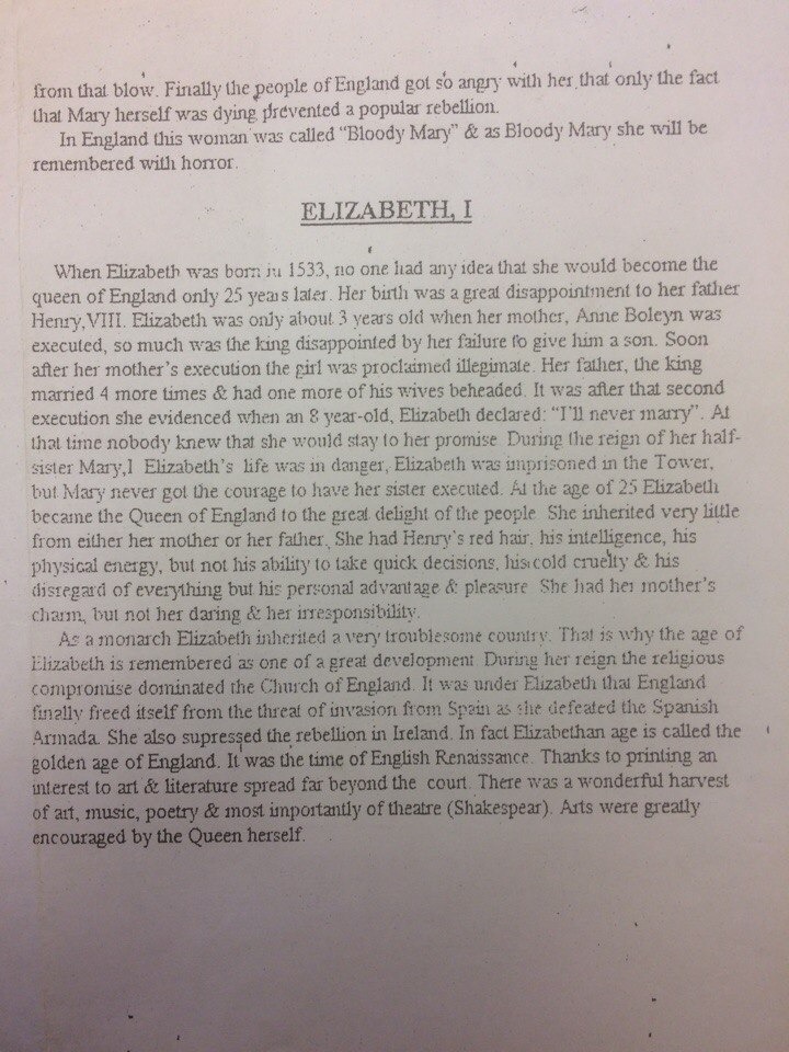 Когда Элизабет родилась в 1533 году, никто не знал, что она станет королевой Англии всего лишь 25 лет. Ее рождение было отличным отвращением к ее отцу Генри VITI Элизабет было всего около трех лет, когда ее мать, Анна Болейн была казнена , так много было разочарование ее разочарования ее сыном. Вскоре казнь ее матери была объявлена незаконной. Ее фалер, король. женился еще 4 раза и имел обезглавленную жену своих жен, обезглавленных. После второй казни она показала, что годовалый, Эгбетбет не умеет жениться ». В то время никто не знал, что она оставит свое обещание. Жизнь сестры Мэрила Элизабет была опасна, Элизабет была заключена в тюрьму в Башне, но Мэри никогда не хватало смелости, чтобы ее сестра была казнен. Аль-Эм-Билль стал королевой Англии, чтобы восхитить людей, которых она унаследовала, от ее матери или ее отца. У нее были волосы Юри, его ум, физическая пища, но не способность убивать быстрых децинов. Люсь холодно, он был безразличен к своему разуму, кроме своих прыгунов и удовольствия от удовольствия, не ее знакомства и ее iTespotisibility Ar монарх Eizabeth унаследовал очень ltoubitsorat countiv Вот почему возраст Элизабет 1emembered как один из великих разработок Dmming ее tegn рискованный компромисс доминировал Climc ч Англии была неженатой Элизабет, что Англия, наконец, освободилась от угрозы вторжения из Испании, она сравняла испанский амаду. Она также подавила восстание в Ирландии. На самом деле Елизаветинская е называется золотым веком Англии. Это было время английского Rrnaissance. Благодаря печати интерес к art & Hterature распространился за пределами суда. Был замечательный урожай искусства, музыки, поэзии и, самое главное, театра (Шекспира), искусство очень понравилось самой королеве