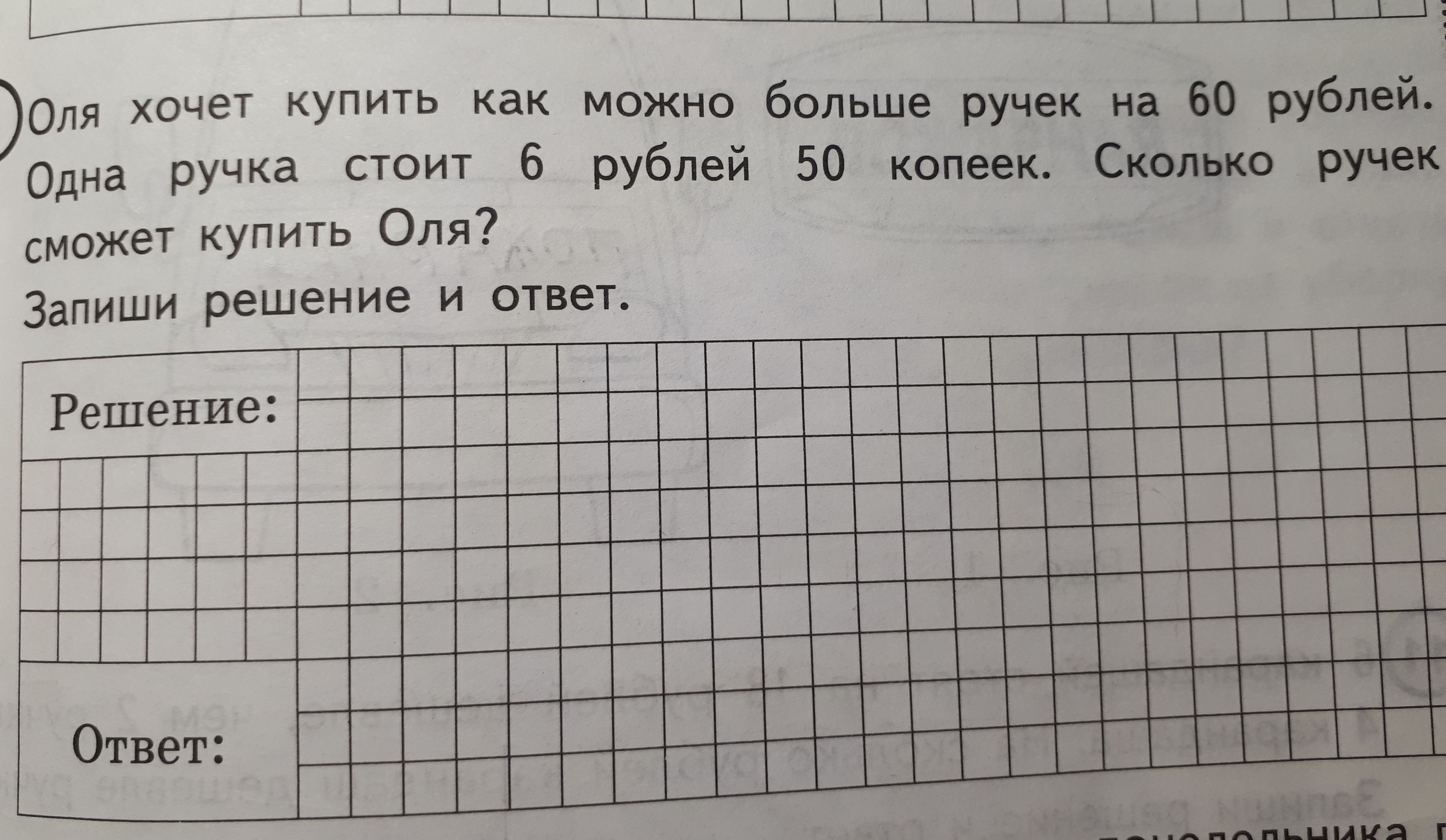 6.50÷58.5=9 Оля сможет купить 9 ручек