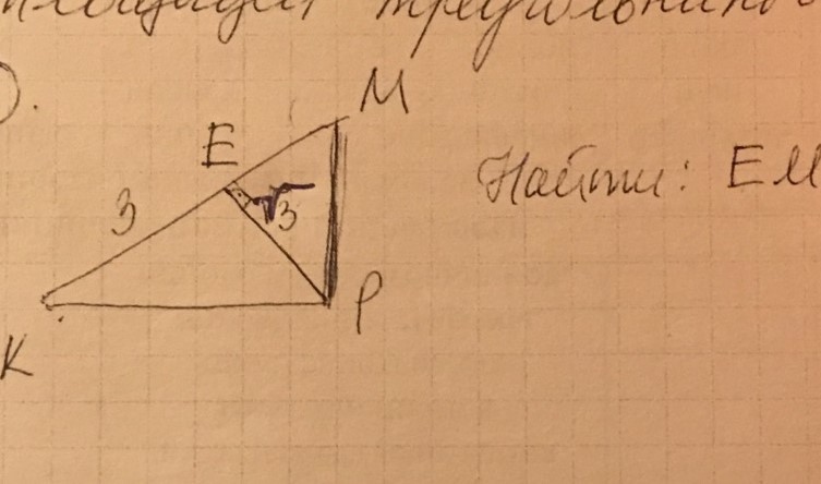 "Высота в прямоугольном треугольнике, проведенная из вершины прямого угла, разбивает прямоугольный треугольник на два подобных треугольника. Кроме того, каждый из этих треугольников подобен исходному". Если как то доказать что рек подобен мер (угол м равен углу ерк),то составив отношения реме=екре и подставив значения увидим что ме равен 3