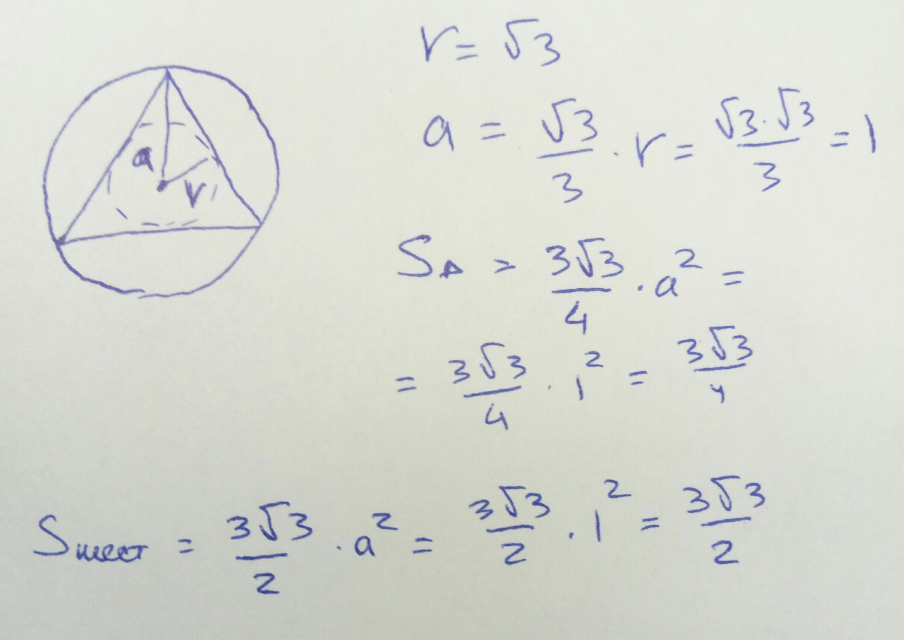 Правильный треугольник и правильный шестиугольник вписаны в одну окружность. Найдите площади этих фигур, если радиус вписанной окружности треугольника равен корень из 3
