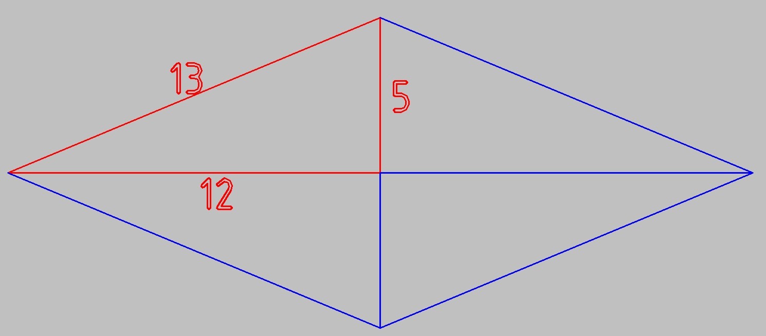 И рассматривая прямоугольный треугольник, образованный стороной ромба и двумя половинками диагоналей (красный) по теореме Пифагора найдём сторону ромба.