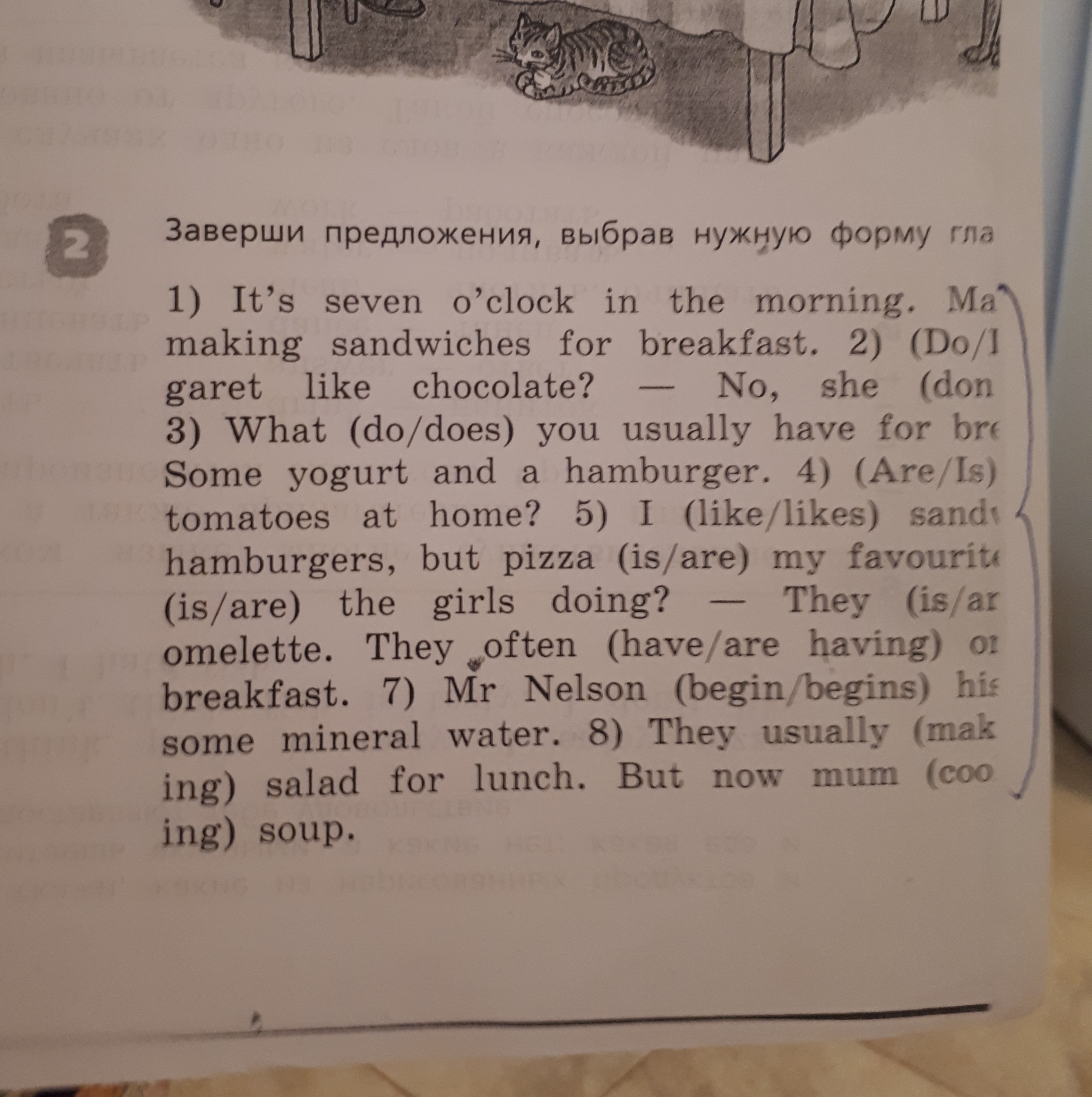 Сейчас 7 часов утра. Мама делает сенгвич на завтрак. (Не знаю что такое гаред) Любит ли кто то шоколад?-нет. Что ты обычно ешь на завтрак?-Йогурт и гамбургер. Есть томаты в доме? Я люблю сенгвич и Гамбургеры, но пицца моя любимая. Что делают девочки-едят омлет. Они часто его едят на завтрак. Мистер Нельсон начинает( что то делать) с минеральной водой.Они обычно готовят салат на обед. Но сейчас мама готовит суп.