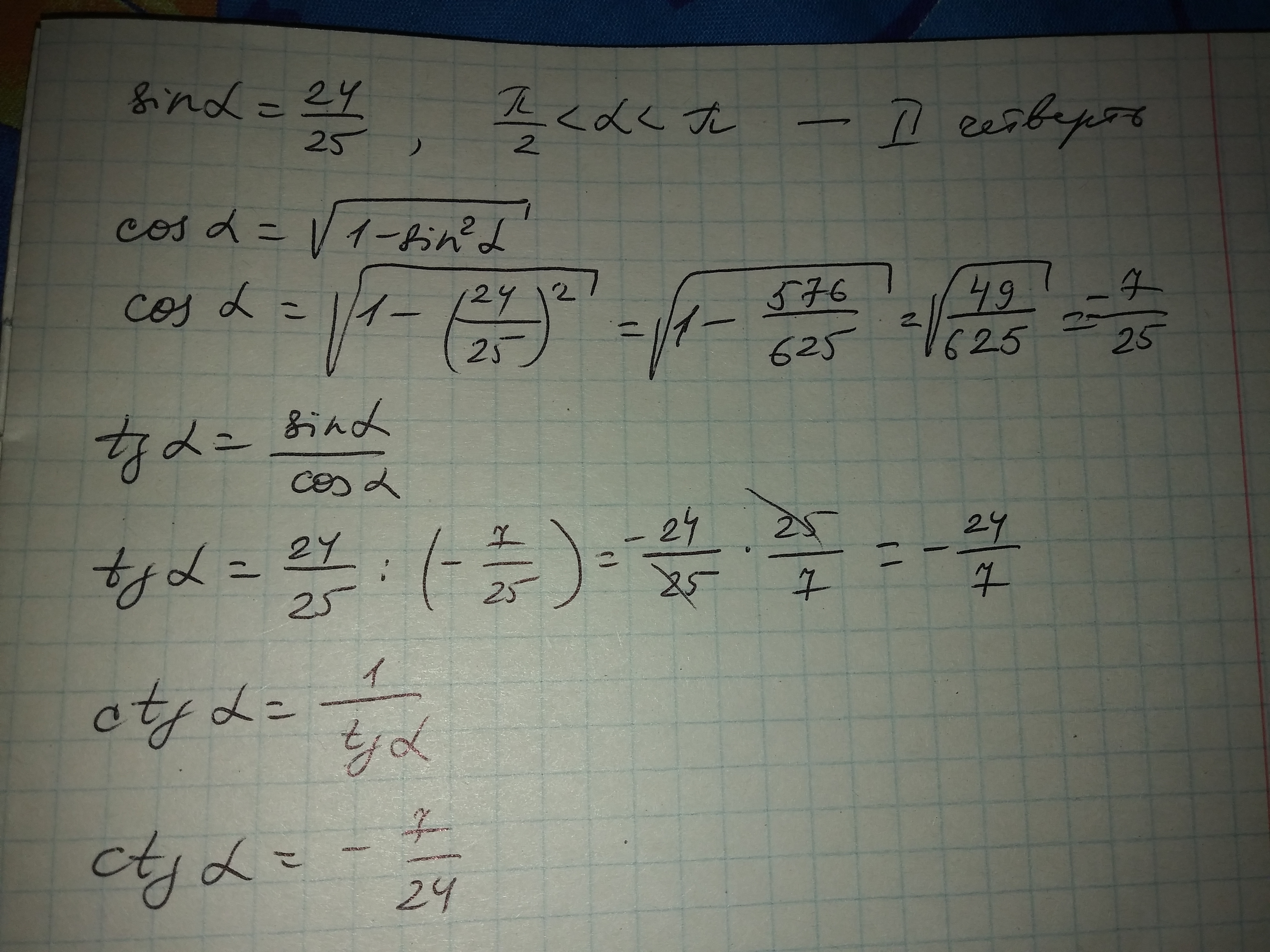 Найдите все остальные тригонометрические функции,если sin угла альфа = дроби 24/25 и дробь pi/2<угла альфа Очень срочно, помогите пожалуйста,осталось всего 30 минут!!!
