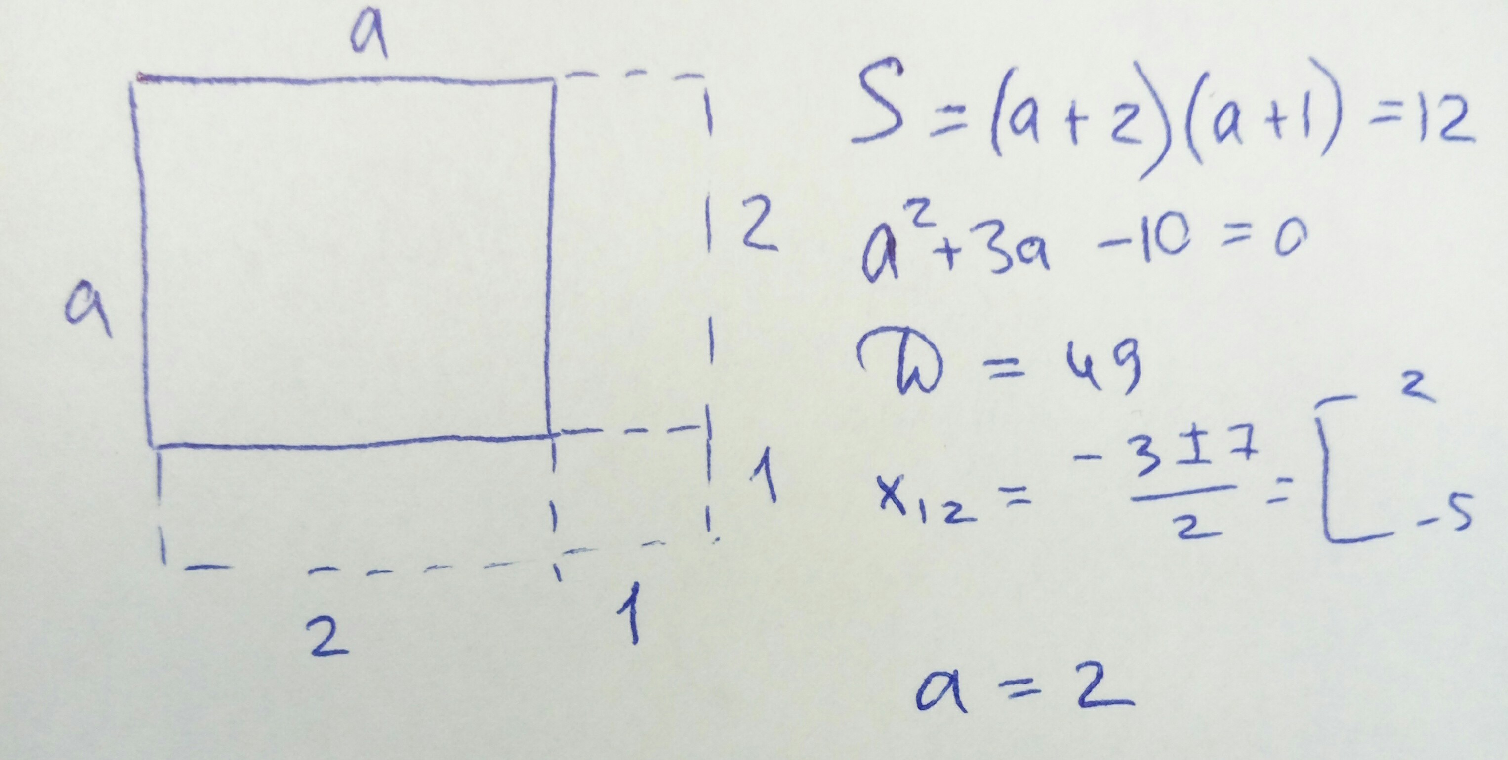 одну сторону квадрата увеличили на 2 см , а вторую на 1 см и получился прямоугольник с S=12см². Найти сторону квадрата + рисунок .