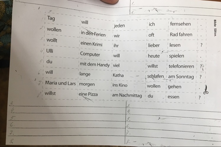 1. Я хочу смотреть телевизор каждый день.2. На каникулах мы хотим часто кататься на велосипеде.3. Вы предпочли прочитать триллер? 4. Улли хочет сегодня играть в компьютер .5. Ты хочешь много разговаривать по сотовому телефону? 6. Хочет Ката в воскресенье долго спать? 7. Мария и Ларс хотят завтра пойти в кино.8. Ты хочешь съесть пиццу о второй половине дня?