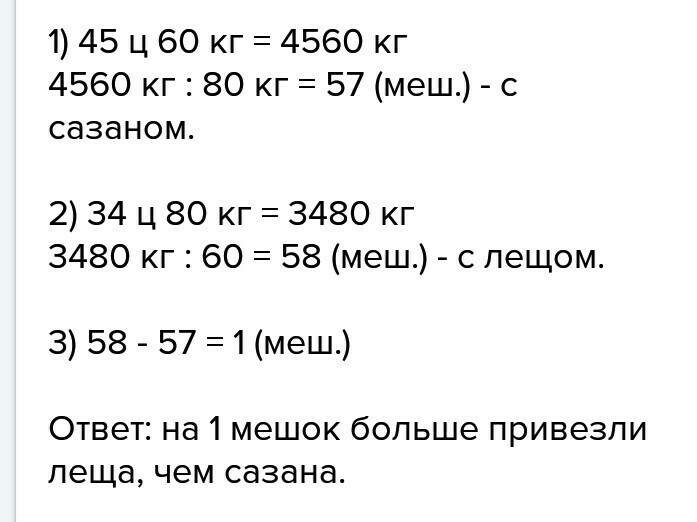 в магазине привезли в мешках в 45 центнеров 60 кг сазана и 34 центнера 80 кг 10 Масса одного мешка с азаном равно 80 кг и 60 кг какой рыбы привезли больше на Сколько мешков больше