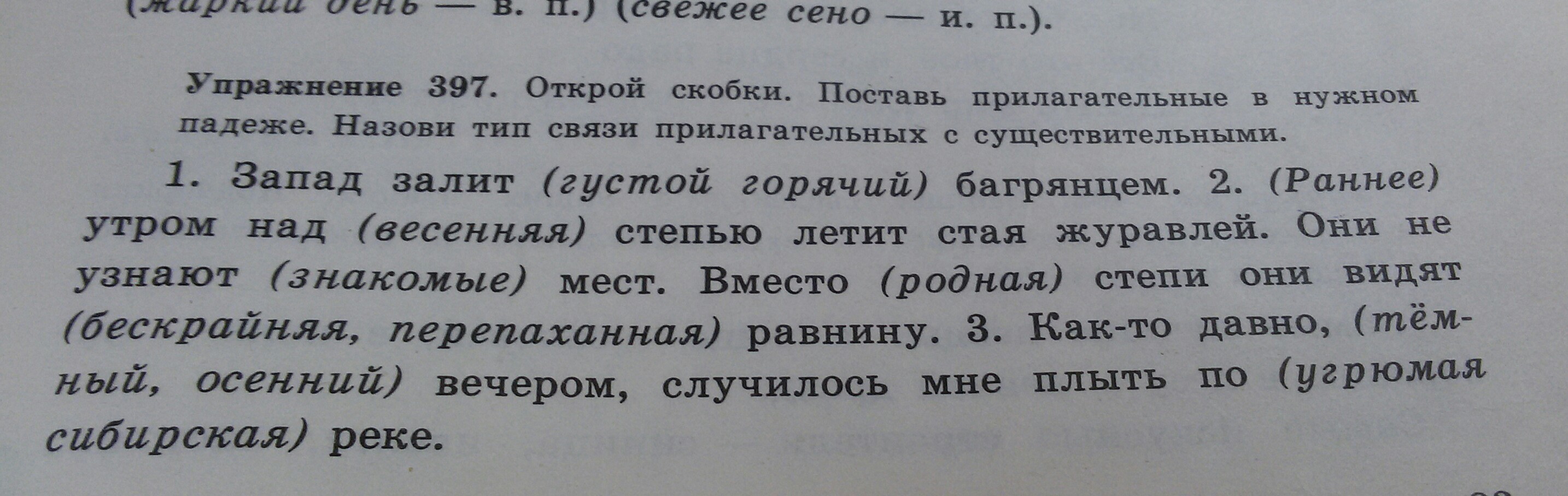 1. Запад залит густым горячим багрянцем. 2. Рано утром над весеннью степью летит стая журавлей. Они не узнают знакомых мест. вместо родной степи они видят бескрайнюю, перепаханную равнину. 3. Как-то давно, тёмным осеннем вечером, случилось мне плыть по угрюмой сибирской реке.