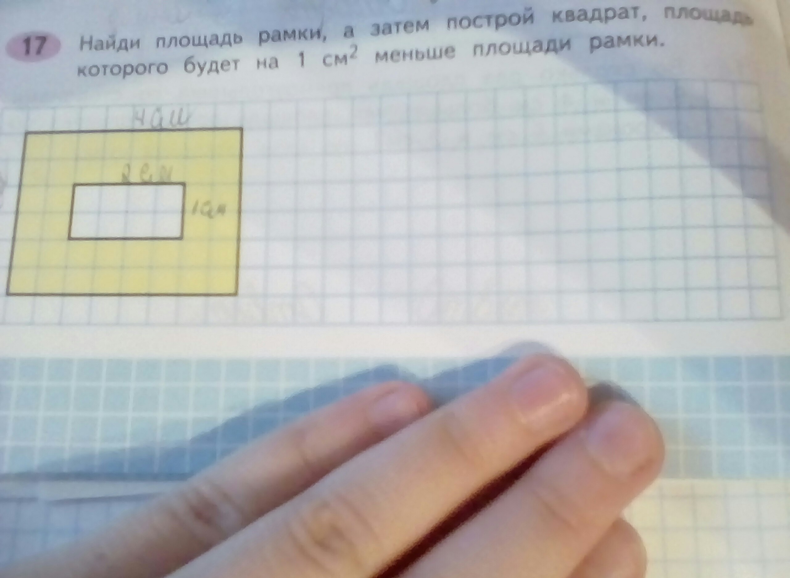 рамки а затем построй квадрат площадь которого будет на 1 см квадратных меньше площади рамки