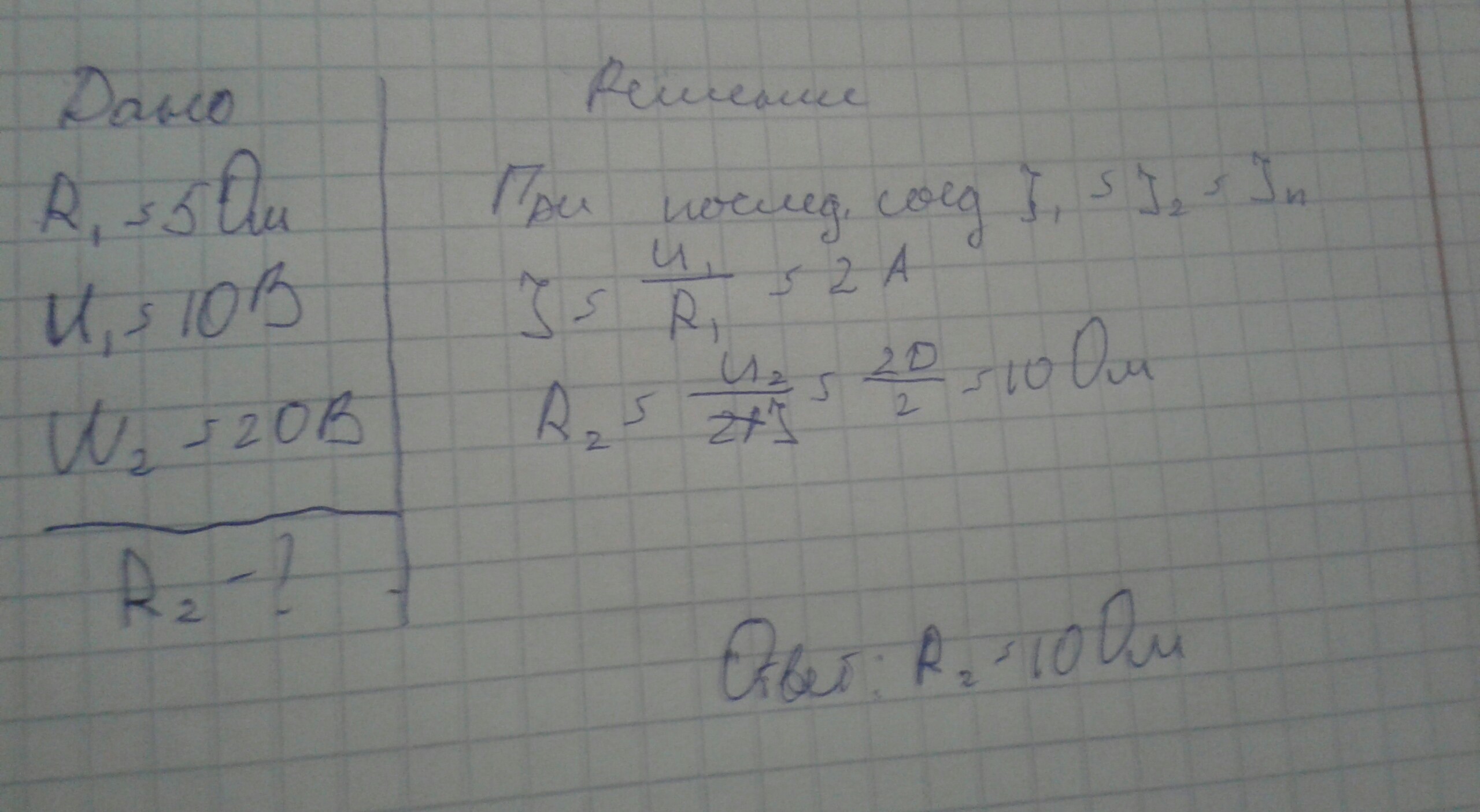 Два резистора включены последовательно. Напряжение на резисторе, сопротивление которого 5 Ом, равно 10 В. Напряжение на втором резисторе равно 20 В. Чему равно сопротивление второго резистора?