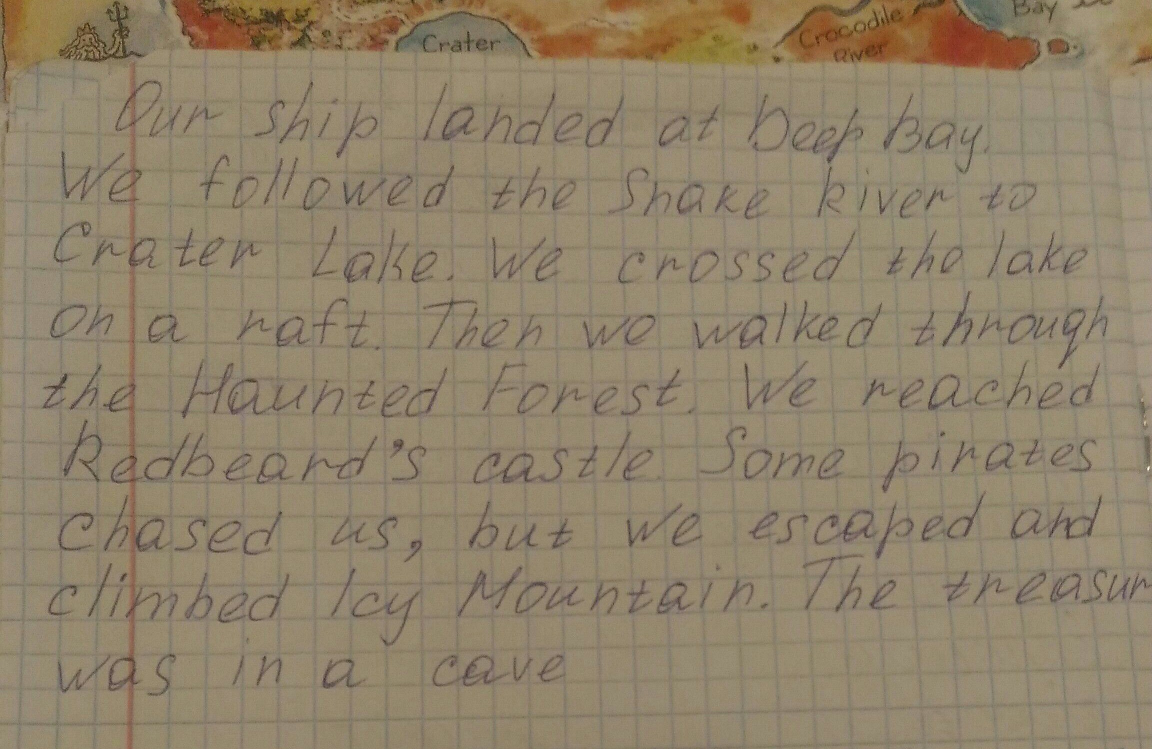Аур шып лэндид эт дип бэй. Ви фолоуд зэ снэйк ривер ту крэйтер лэйк. Ви кросд зэ лэйк он э рафт. Зэн ви волкт тхроу зэ хаунтид форэст. Ви ричед рэдбеардс касл. Сам пирэйтс чэйсд ас, бат ви эскепд энд клаймд айцу маунтин. Зэ треасур вос ин э сэйв