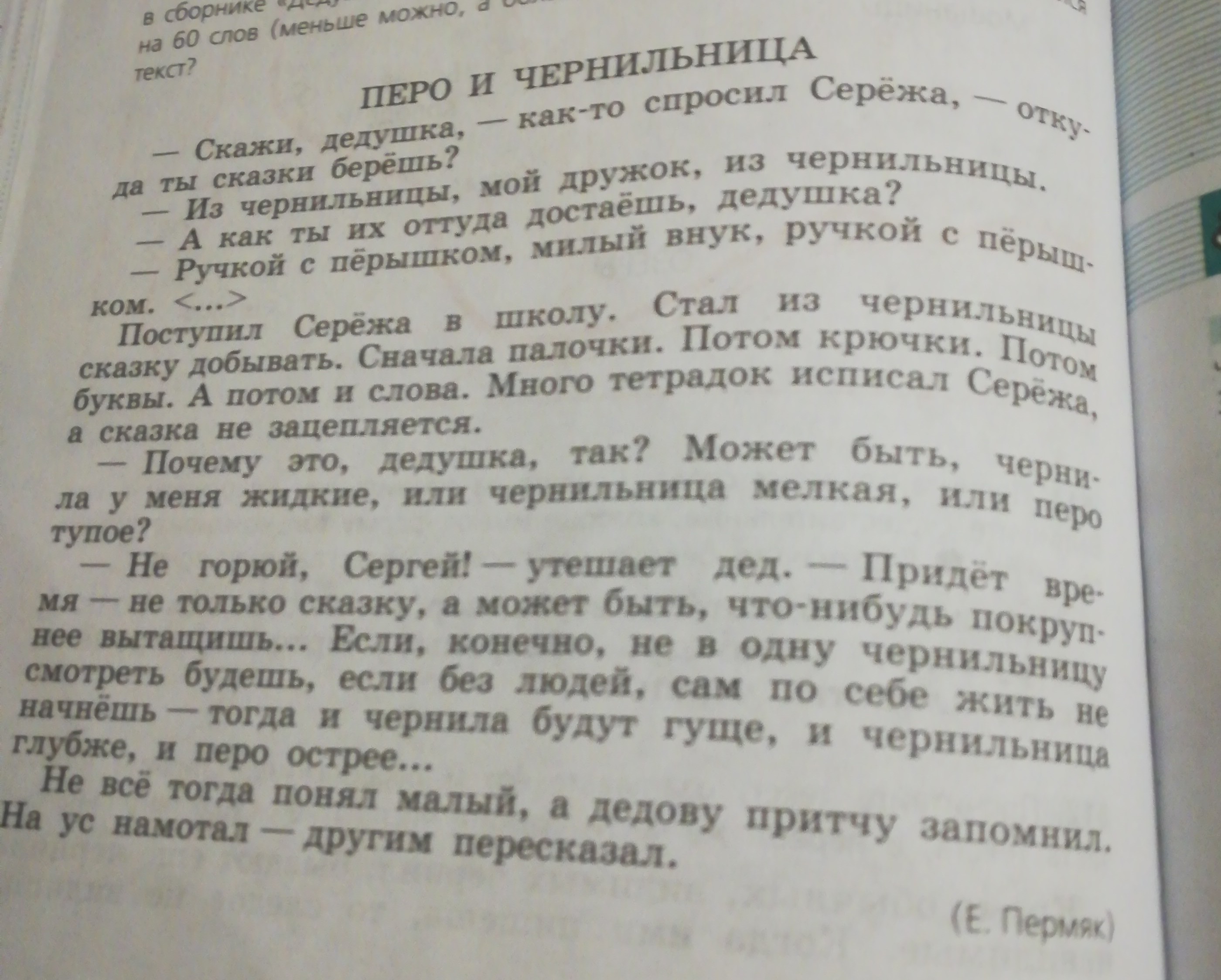 Поступил Серёжа в школу, стал прилежно изучать правописание в надежде освоить науку словотворчества... Но сочинить сказку мальчику не удавалось.. .Опечалившись, Серёжа рассказал дедушке о своих неудачах. Дед успокоил внука, заверив, что, присматриваясь к жизни, к людям, накапливая личный жизненный опыт, Серёжа "достанет нужные слова из чернильницы".