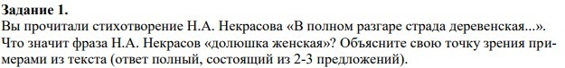 Фраза Н.А. Некрасова "долюшка женская" из стихотворения "В полном разгаре страда деревенская..." означает все те испытания, через которые проходила простая русская женщина-крестьянка. Женская доля действительно была тяжела, ведь "бедная баба из сил выбивается" на пахоте и сборе урожая, как и мужчина, а ей ещё и "надо ребенка качать". Это не просто действия, которые можно выполнить, а можно и нет, потому что за неё это никто не сделает. Вот так и получается, "что ты вянешь до времени, / Всевыносящего русского племени / Многострадальная мать", вынужденная переносить все тяготы крестьянской жизни.
