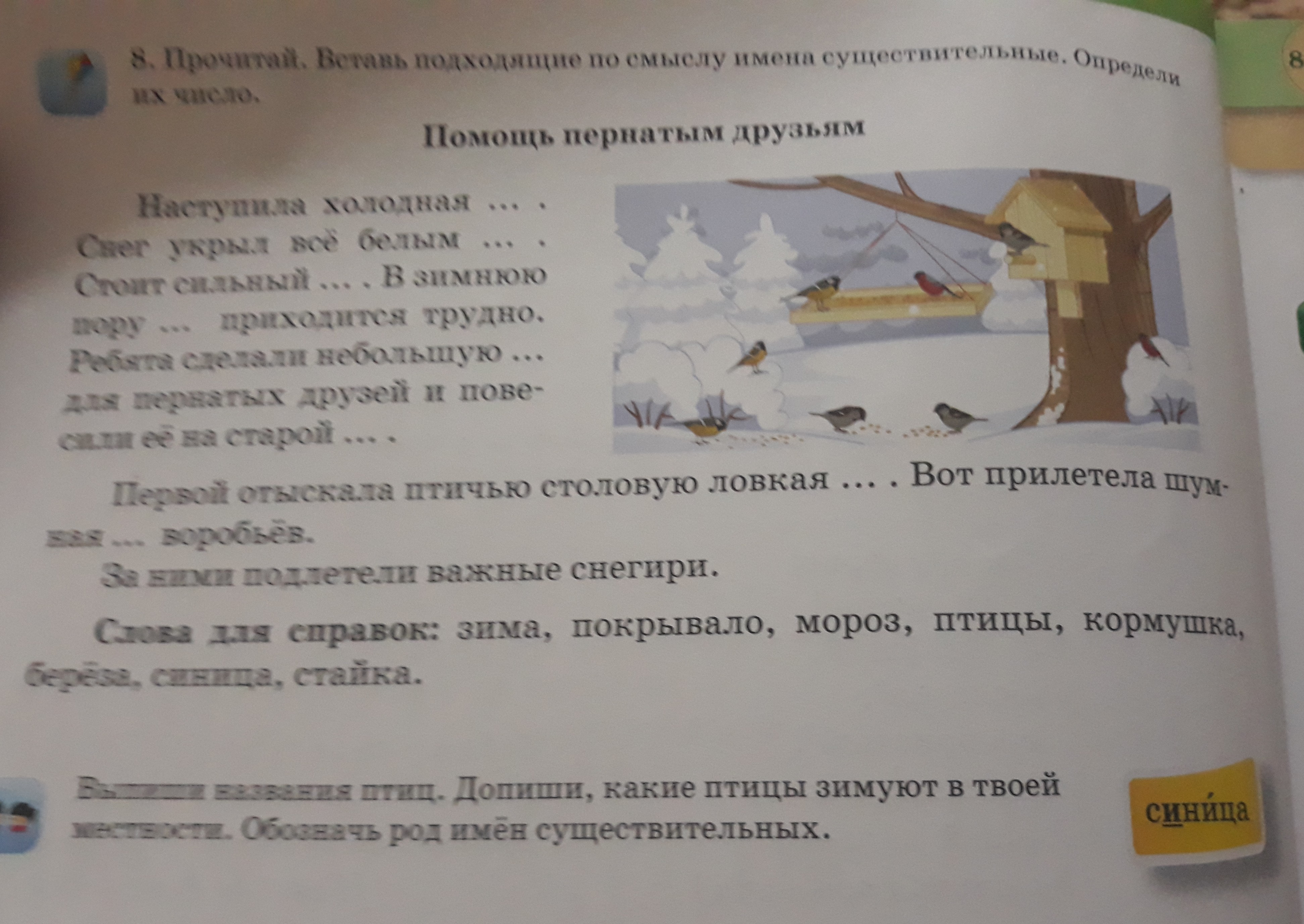 Первой отыскала птичью столовую ловкая синица. Вот прилетела шумная стайка воробьёв.