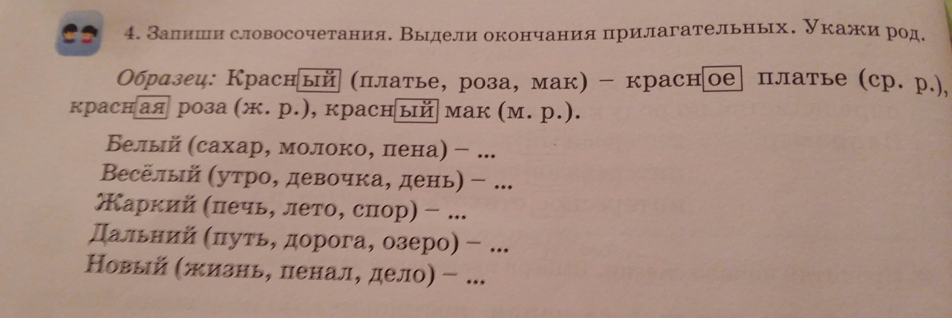 5.Новый(окончание ый)(жизнь,пенал,дело)-новая жизнь(окончание ая)(ж.р.), новый пенал(окончание ый)(м.р.), новое дело(окончание ое)(ср.р.)