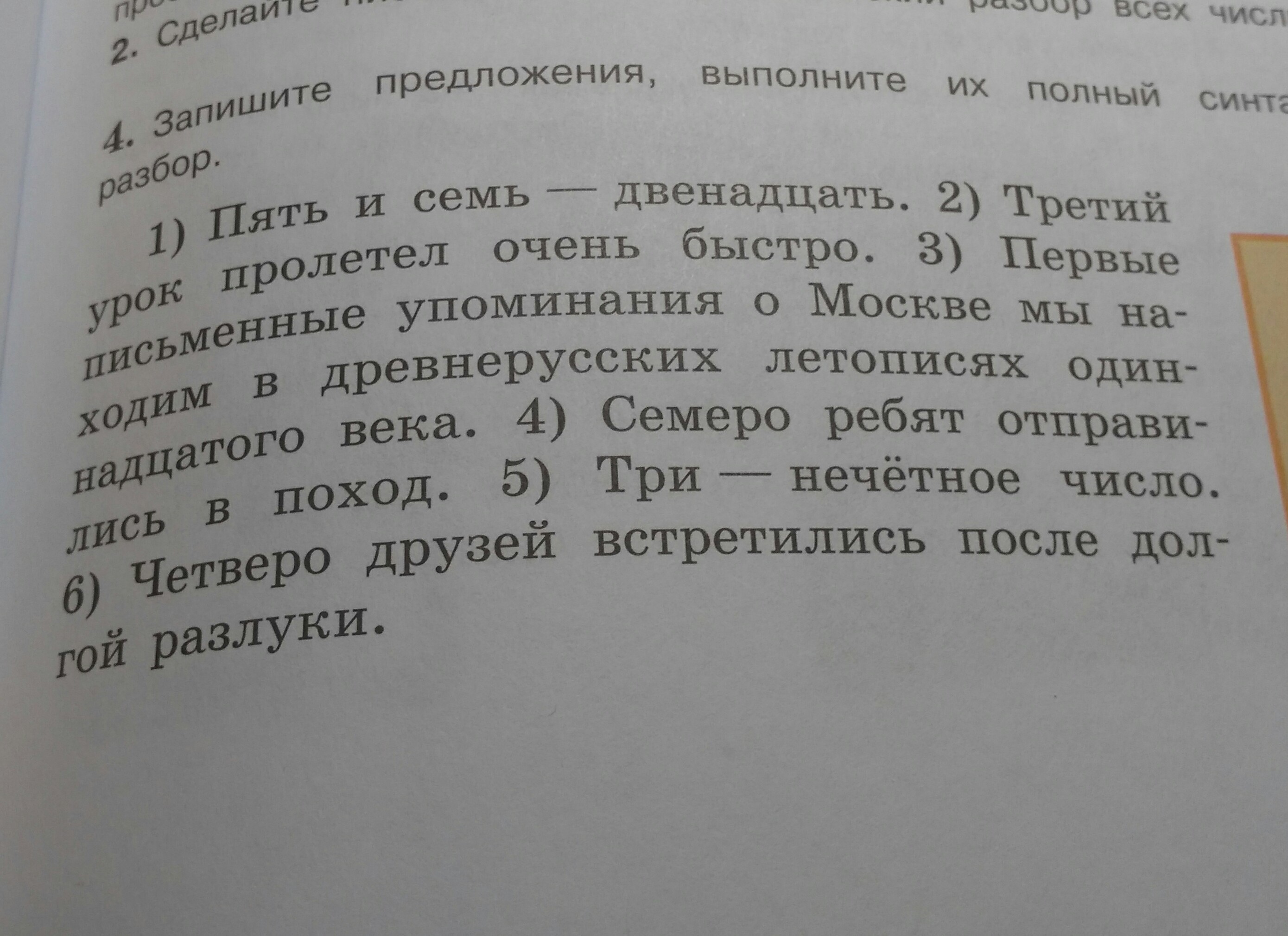 1)Пять(сущ) и семь(сущ)-двенадцать(сказ). 2)Третий(прил) урок(сущ) пролетел(сказ) очень(обст) быстро(обст). 3)Первые(прил) письменные(прил) упоминания(доп) о Москве(доп) мы(сущ) находим(сказ) в древнерусских(прил) летописях(доп) одиннадцатого(прил) века(доп). 4)Семеро(доп) ребят(сущ) отправились(глагол) в поход(обст). 5)Три(сущ)-нечётное(прил) число(сказ).6)Четверо(доп) друзей(доп) встретились(сказ) после(обст) долгой(прил) разлуки(доп).